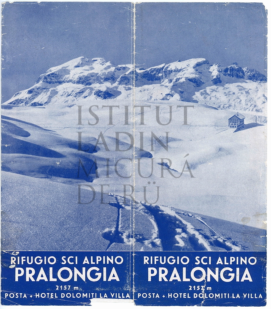 Descriziun: Brosciüra dla ütia da munt Pralongiá, 2157 m. Al vëgn fat reclam ala ütia da munt Pralongiá y al Hotel Dolomiti, mo ince ala contrada; implü vëgnel publicizé i cursc da jí cui schi.