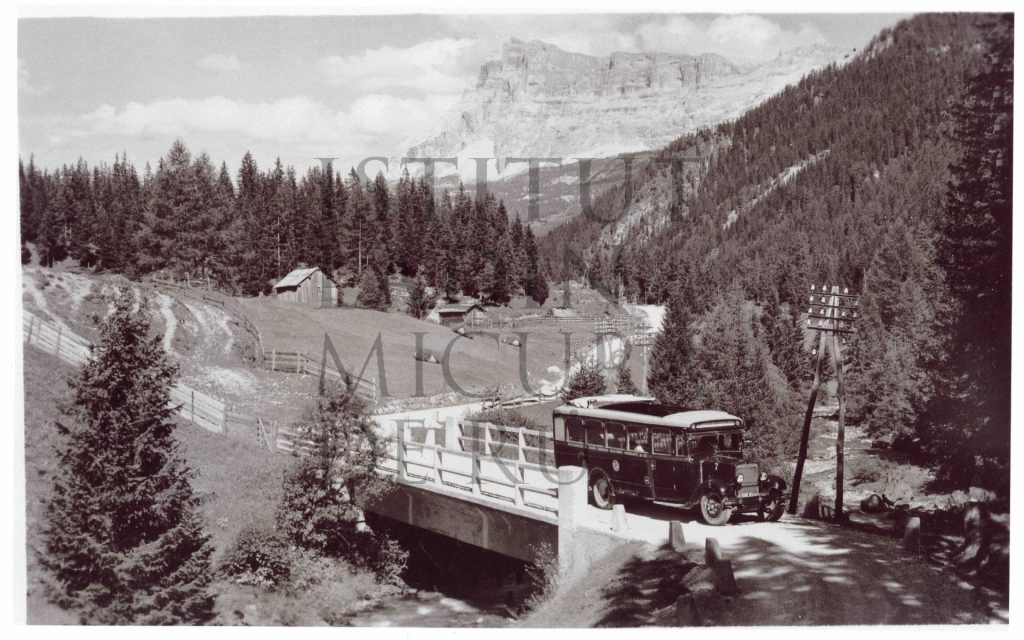 Descriziun: Copia de na fotografia vedla dl auto dla posta "Kostner y Videsott" sön le punt da Bos a Corvara.