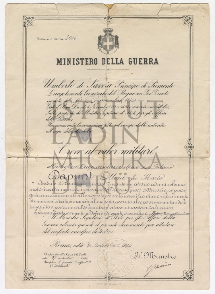 Atestat por la Crusc al mirit militar de Otto Dapunt