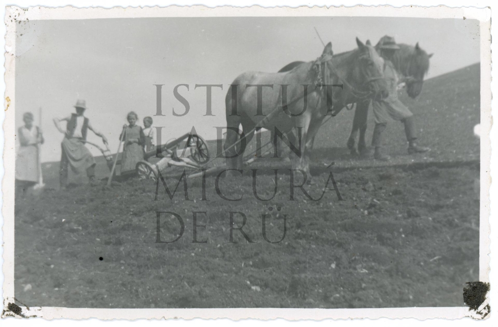 Descriziun: Fotografia che rapresentëia la familia Dapunt tl laur da aré n ciamp cun na cadria dal ciaridel.