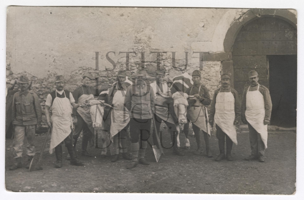 Descriziun: Fotografia che rapresentëia n grup de bocas-soldas che laurâ a La Ila tratan la Pröma Vera Mondiala.