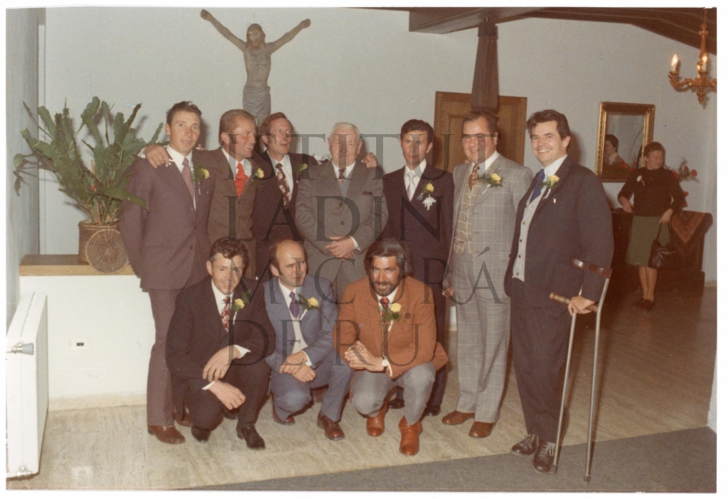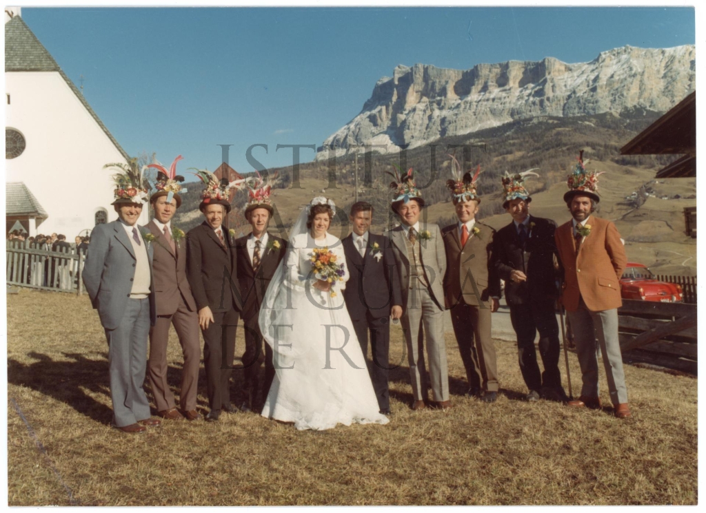 Descriziun: Fotografia de n grup de ëi vistis a festa en ocajiun dla noza de Andreina Sigismondi y Iaco Granruaz.
