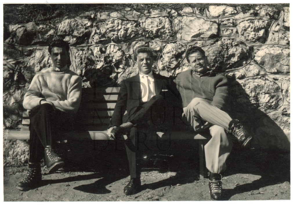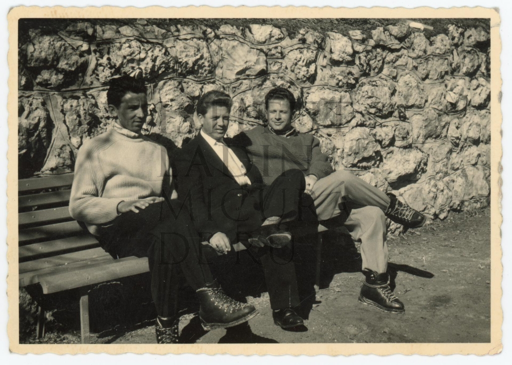 Descriziun: Fotografia che rapresentëia i trëi fredesc Giuvani, Hermann y Fortunato Pescollderungg dl "Hotel Dolomiti".