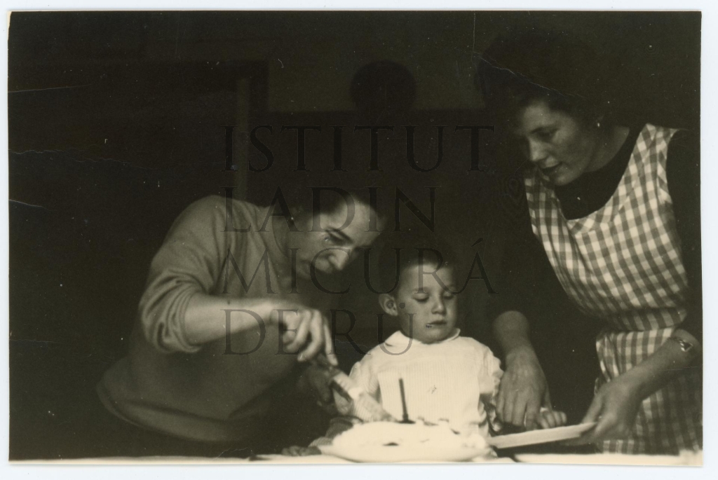 Descriziun: Fotografia che rapresentëia n möt, n'ëra che taia sö na turta de compliagn y Hilda Crazzolara che dá na man.