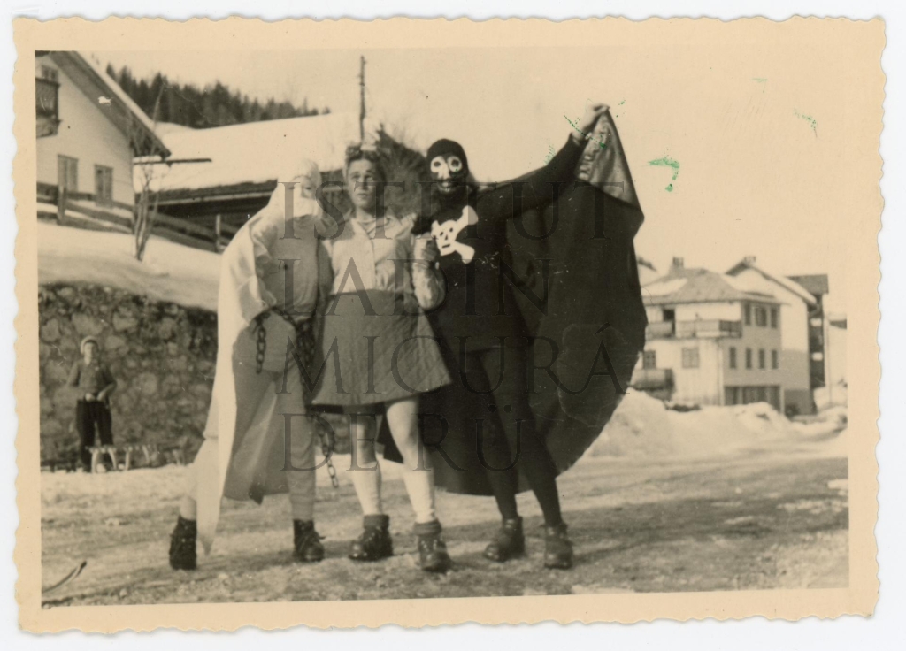 Descriziun: Fotografia che mostra trëi porsones vistides sö por Carlascé sön la strada dan le Hotel Dolomiti.