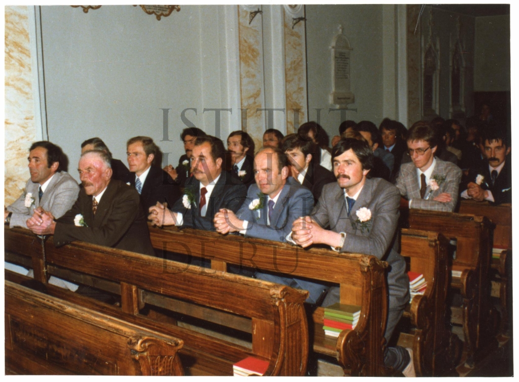 Descriziun: La fotografia rapresentëia n grup de ëi sentá te proca tratan la noza de Alma Vittur y Oskar Costa.