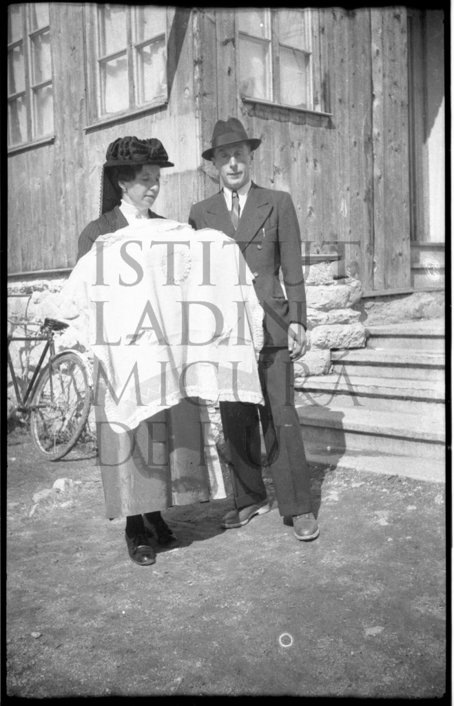 Descriziun: La fotografia rapresentëia Leopold Agreiter, adöm a n'ëra che tëgn n pope söl brac; bonamënter le de dl bato dl pope.