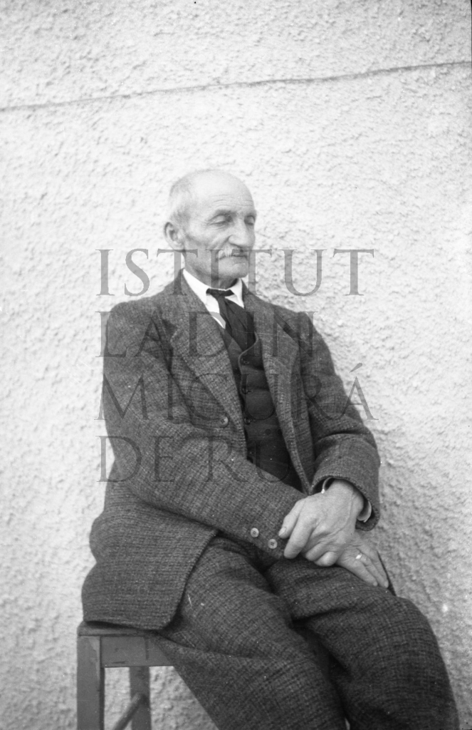 Descriziun: Le retrat rapresentëia n berba, senté sön n scagn.