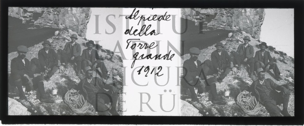 Descriziun: Sön la fotografia él n grup de alpinisć, sentá ai pisc dl Torre Grande tles Cinque Torri. L’ël jödapé a man dërta á indos le distintif da mënacrëp, al podess se traté de Celestino De Zanna. L’ël sön la man ciampa cun la coppola é n cer Dr.Fröhlich, che vëgn dant te atres fotografies de arpizades.