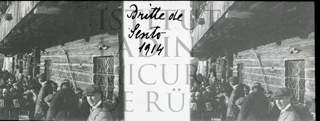 Descriziun: Sön la fotografia vëigon n grup de porsones sentades pro les mëses de fora de na malga (brito/brite por ampezan) tratan n momënt de aurela cörta. Jödapé a man ciampa vëigon n per de mituns cun indos n numer, che fej ponsé che al podes se traté de na gara de schi.
