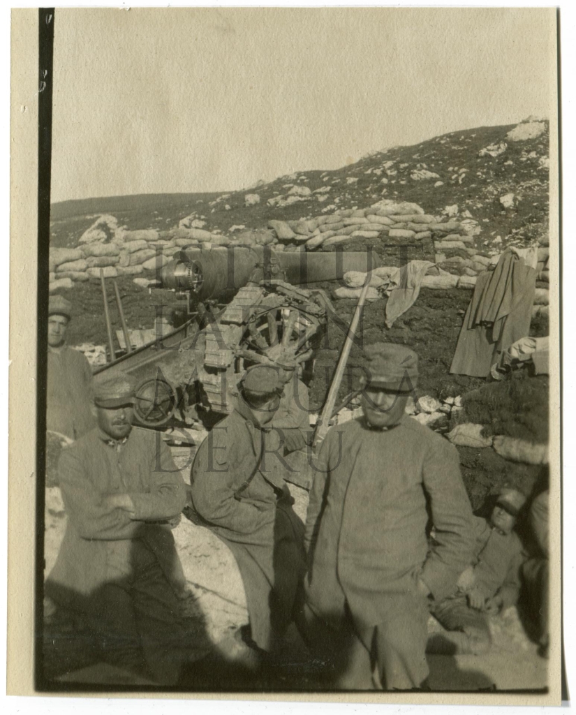 Descriziun: Soldas talians te n fossé da combatimënt sön Falzares stá sö por se lascié fotografé dlungia al canun.