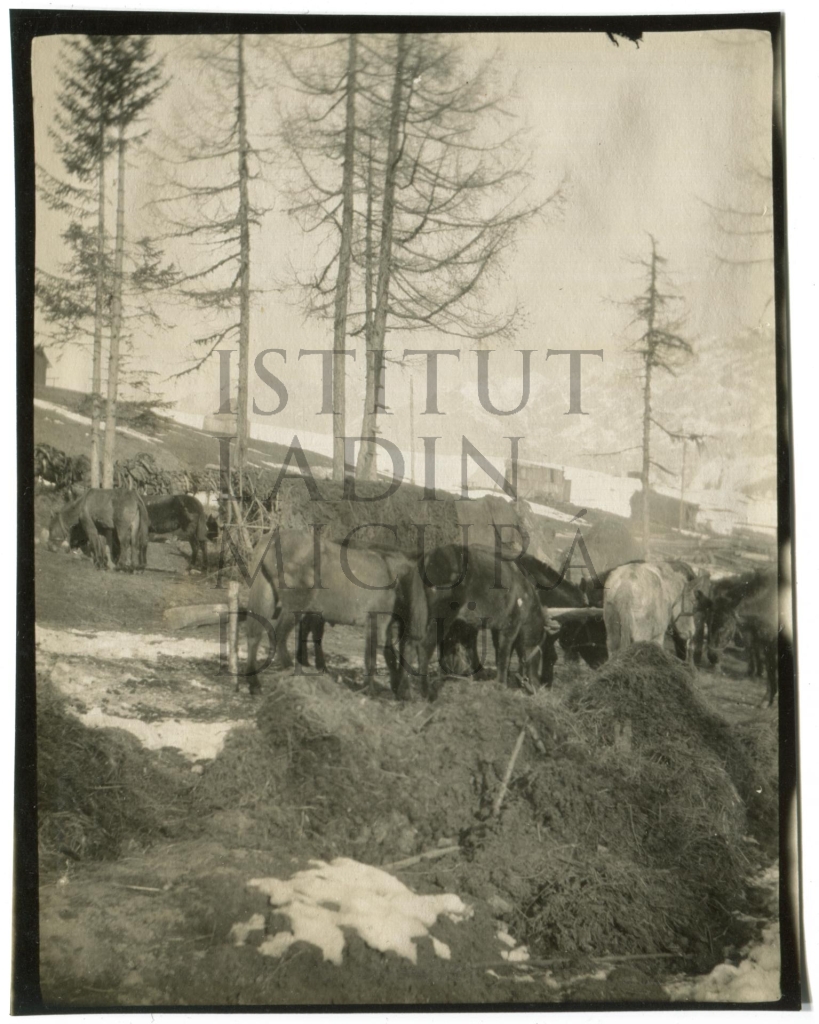 Descriziun: Sön la fotografia vëigon deplö ciavai y müsc dlungia n aciampamënt di soldas talians.