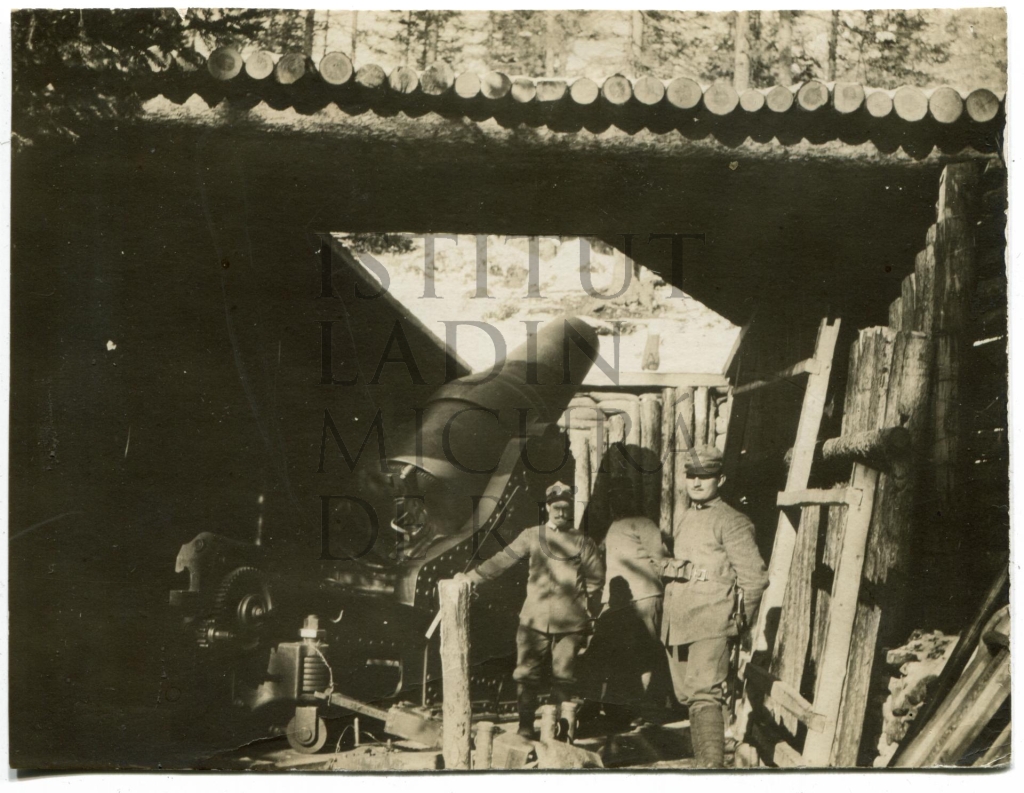 Descriziun: Soldas stá sö por la fotografia dlungia n'aubiza (sort de canun) caliber 280, te n fossé a combatimënt a Fiames.