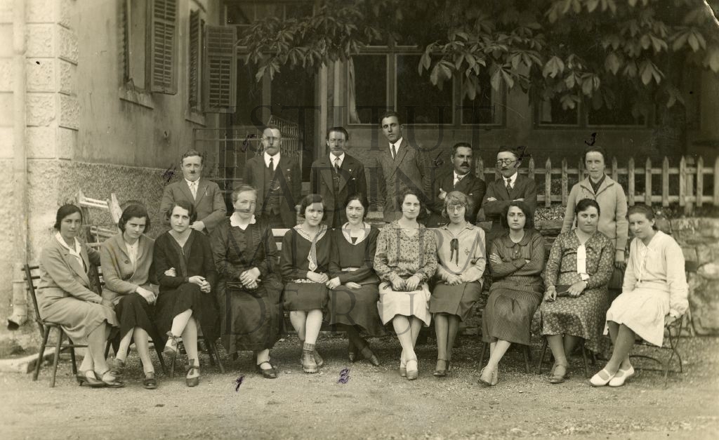 Descriziun: Danter l'ater él lapró: 1. Scolastica Pizzinini Vittur de Badia, 2. Emma Menardi d'Ampëz (maestra a La Pli), 3. Anna Dapoz da La Val, 4. Franz Pizzinini da La Ila, 5. Dalbosco - diretur - da Bornech, 6. Giuvani Ruazzi da San Ciascian, 7. Dr. Lejio Baldissera - La Val (La Pli).