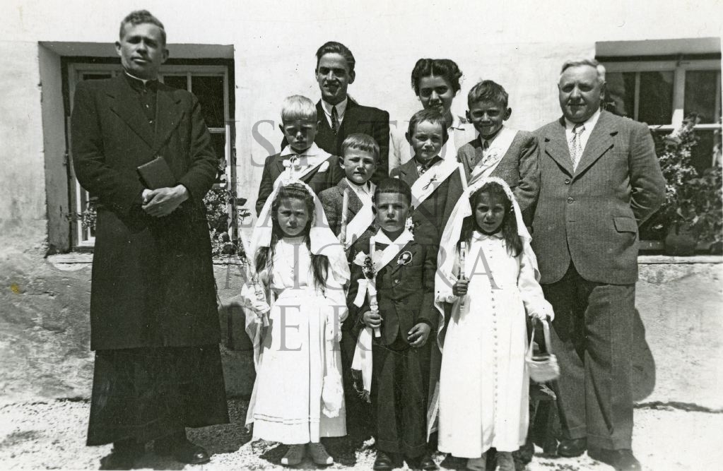 Descriziun: La maestra Maria Maddalena Sief da Col de Santa Lizia en le de dla pröma comuniun a La Ila. Al ê so secundo ann da maestra. Lapró él ince le prou, siur Valerio Frenes, y le maester Lejio Lezuo, le jorman de Maria Maddalena, y le maester Franzl Pizzinini de Micurá. I scolars é Erich Fistill, Giovanni Frenademez, Giovanni Valentin, Rodolfo Granruaz, Leo Pitscheider, Hilda Sorarú, M. Luisa Granruaz.