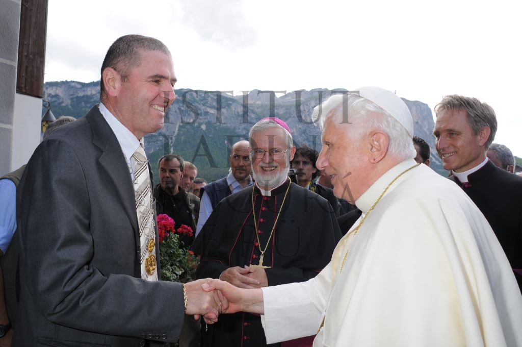 L'ombolt de Badia Ugo Dorigo ti dà le bëgngnü a papa Benedikt XVI. Iadedô vëigon ince le vësco Wilhelm Egger (religiun, Sant Ujöp da Oies, vijita dl Papa sö Oies).
