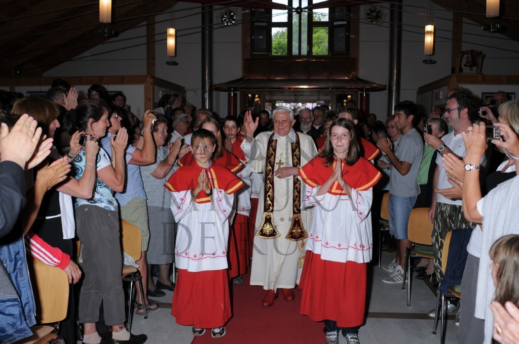 Le papa Benedikt XVI. röia tla dlijia da Oies, acompagné dai ministranc de Badia, danter l'aplaus dla jënt (religiun, Sant Ujöp da Oies, vijita dl Papa sö Oies).