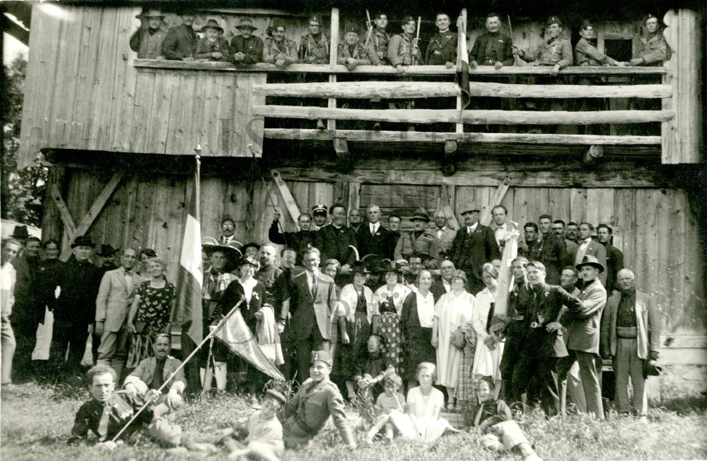Descriziun: Bunamënter éra gnüda fata en ocajiun de na vijita dl prefet o de val' atra autorité da odëi sön sorà cun n tlap de avanguardisc, ci che spligass ince les mondur y les ciamëjes fosces y la bandira dant cun la scrita "Vetta d'Italia". Sön le retrat bel a man dërta él da conësce fora Hans Mutschlechner dl Pech, le nene de Elsa Videsott Gasser da pert dla uma. La fotografia aldî pro la coleziun de Paul Videsott, le pere de Elsa. Iadedô él scrit: "Lina [dl Canins] e suo fidanzato [?...]".