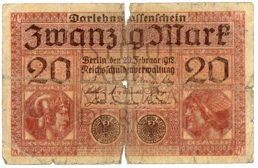 Descriziun: Darlehnskassenschein da 20 march, zetola dada fora dal'Aministraziun por i debic dl Reich todësch.