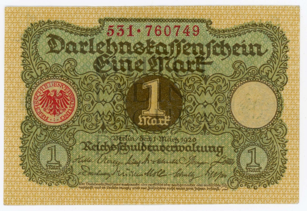 Descriziun: Darlehnskassenschein da 1 n march, zetola dada fora dal'Aministraziun por i debic dla Republica de Weimar.