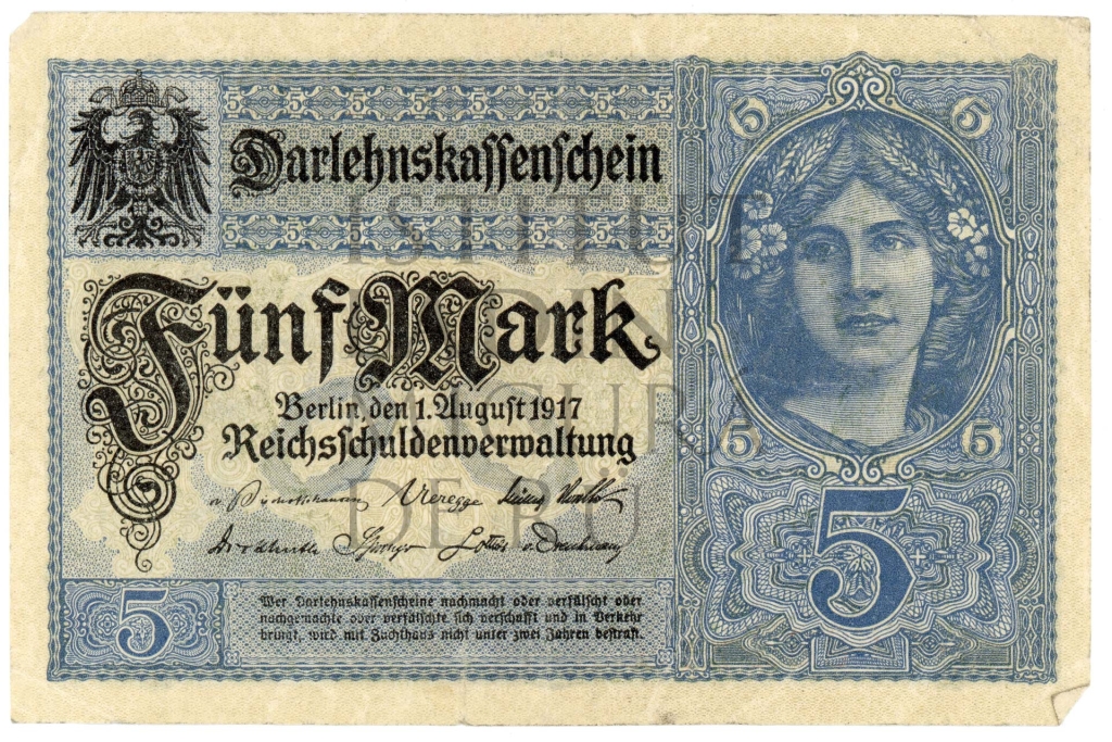 Descriziun: Darlehnskassenschein da 5 mark, zetola dada fora dal'Aministraziun por i debic dl Reich todësch.