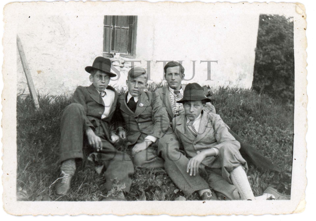Descriziun: Le retrat mostra cater jogn, bonamënter da la Ila, sentá sön n pre dan da na ciasa.