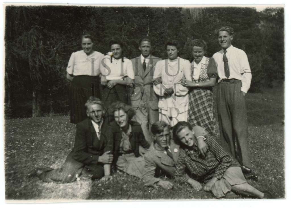 Descriziun: Le retrat mostra n grup de jogn da La Ila metüs sö sön n pre.