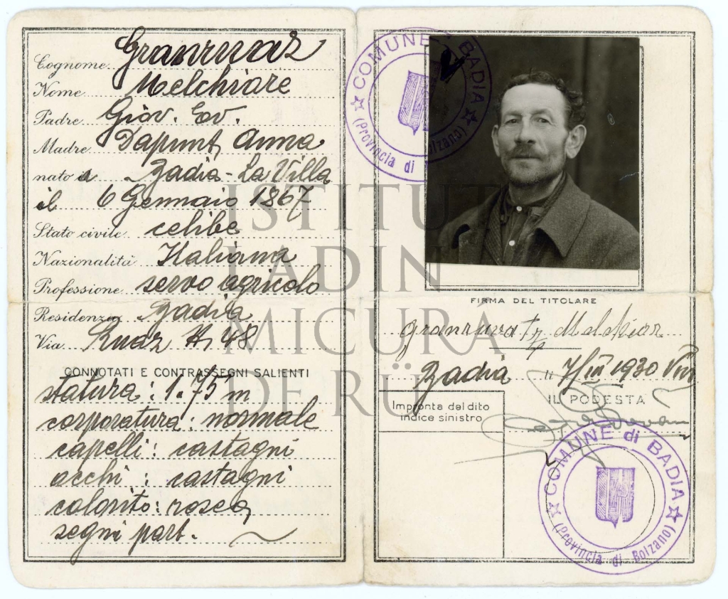 Descriziun: Cherta d'identité dada fora tl 1930 a Granruaz Melchiore, paur da La Ila, nasciü ai 6 de jená dl 1867.