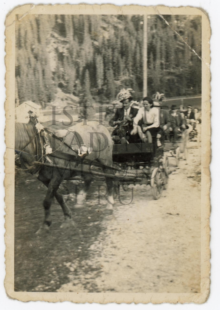 Descriziun: Le retrat mostra porsones trasportades da güces tratan na noza; da odëi éle n per de ëi cun le ciapel da plömes.