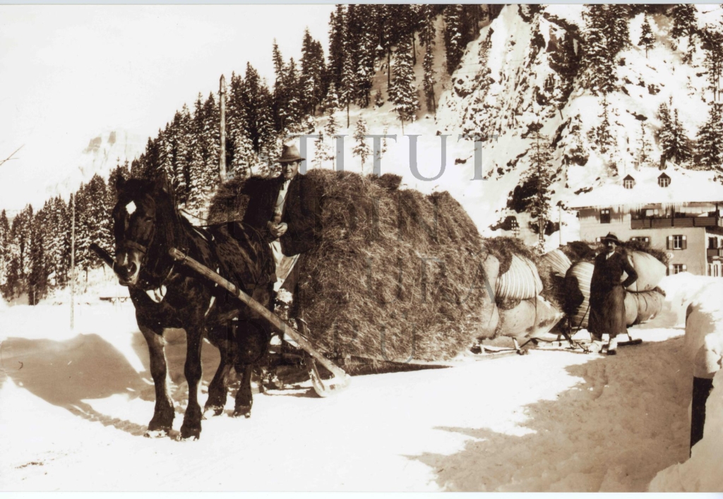 Descriziun: Copia de na fotografia vedla che mostra liöses da fëgn menades da n ciaval, bonamënter a Corvara.