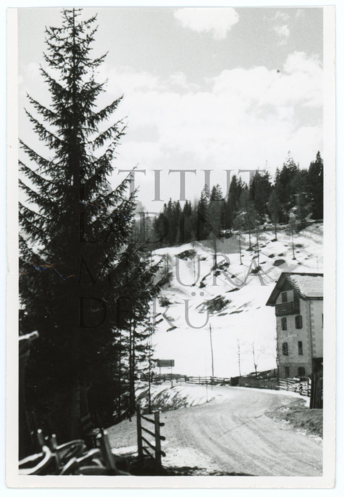 Descriziun: Odüda dla strada atira daite dal Dolomiti en direziun de Corvara; sön la man dërt vëigon la vedla costruziun dl Garni Fiori.