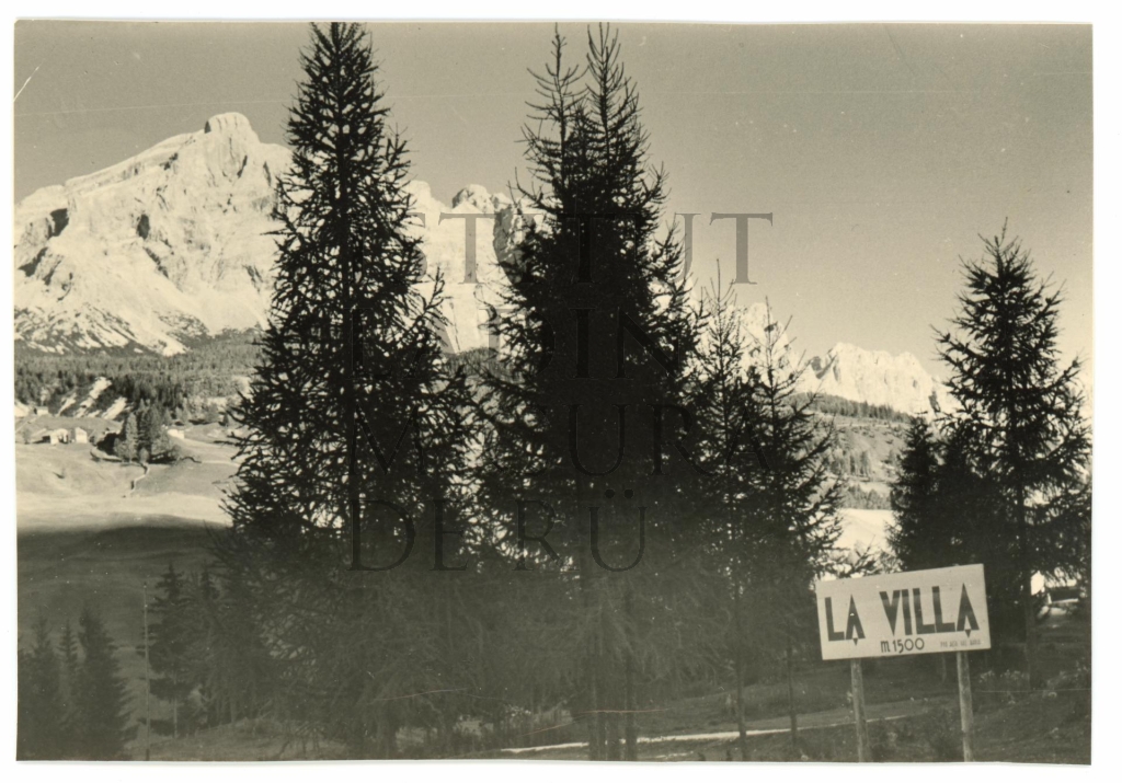Descriziun: Segnal stradal cun la scrita "LA VILLA m1500 - Alta Val Badia".
