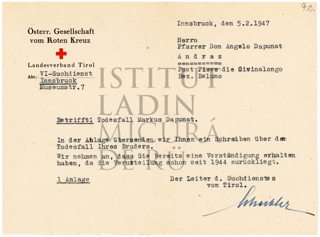 Descriziun: Chësc documënt, resté zoruch ti ofizi dl comun de Obertilliach, é gnü mené inant dal ombolt Josef C. ai 13 de jená dl 1947 ala Crusc Cöcena dl'Austria, cun sënta a Desproch, che le á spo ortié ai parënc de Merch Dapunt. Le documënt, bonamënter dl 1944, é la comunicaziun dl'esecuziun dla condana a mort de Merch Dapunt.