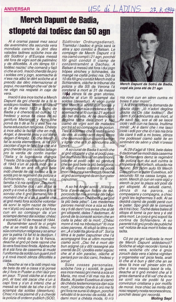 Descriziun: Aricul publiché tla "Usc di Ladins" en gaujiun dl aniversar di 50 agn dala mort de Merch Dapunt.