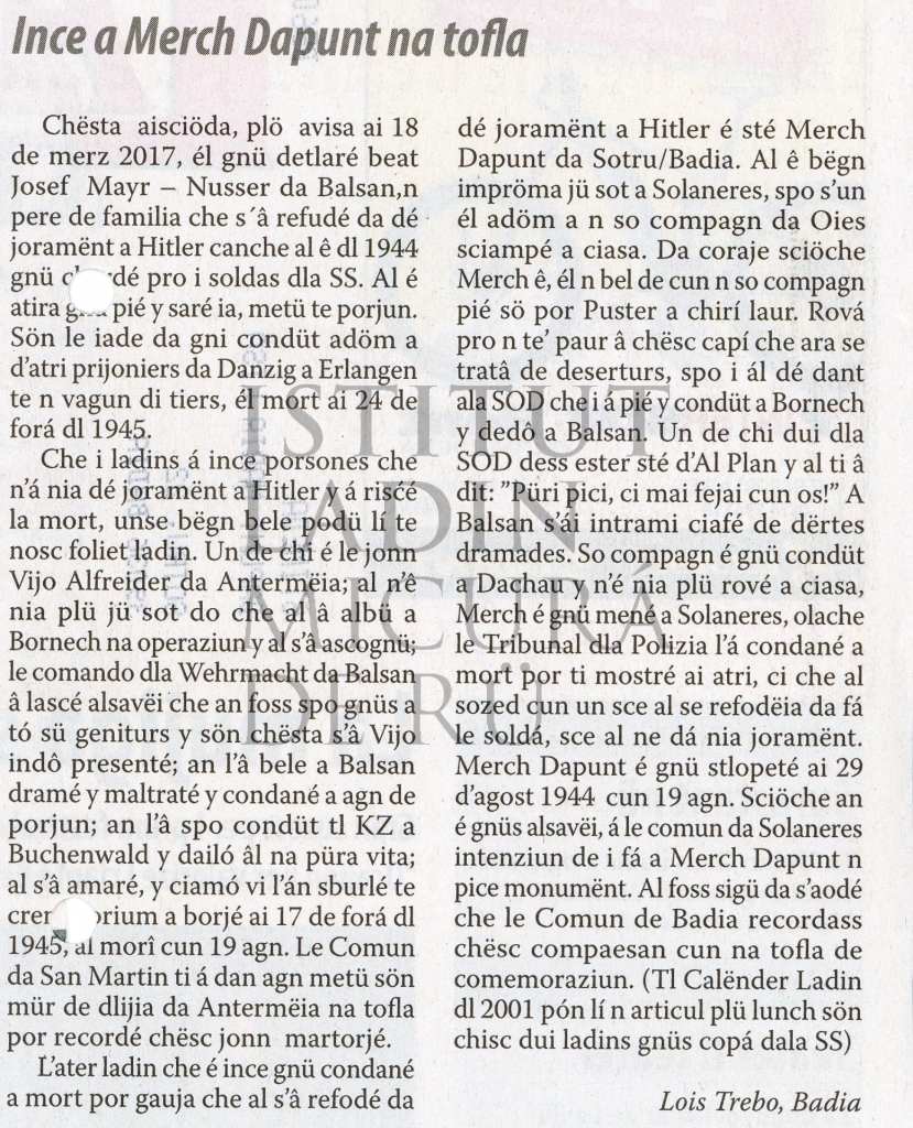 Descriziun: Pice articul de Lois Trebo publiché tla "Usc di Ladins" che porta dant le bojëgn dl Comun de Badia da dediché na tofla de comemoraziun o n monumënt cichessî a Merch Dapunt.