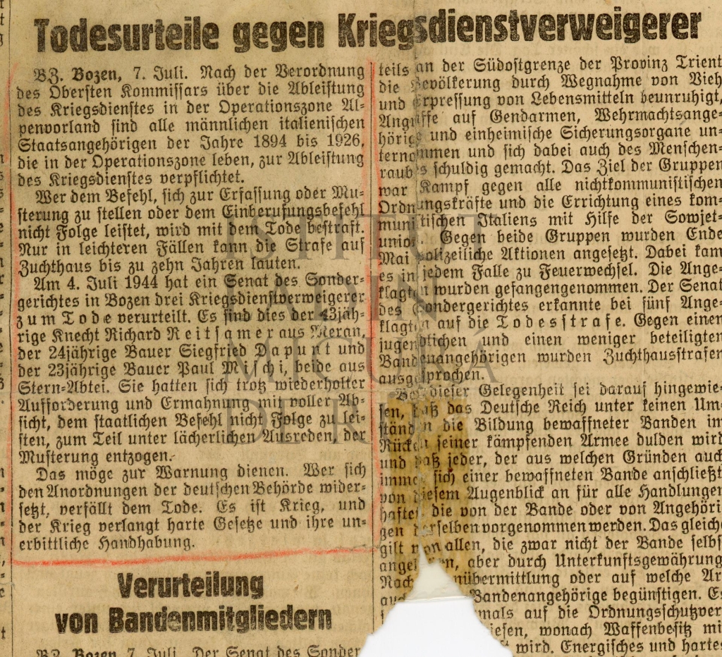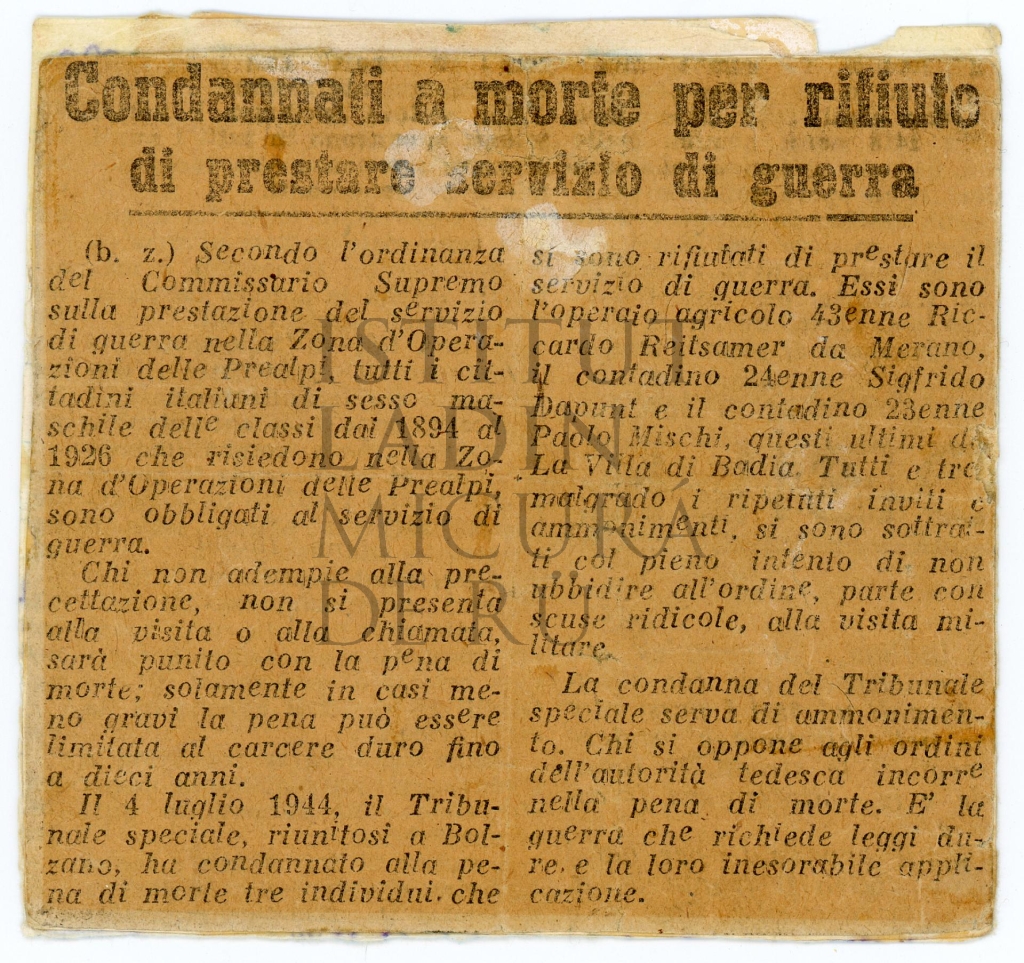 Articul scrit por todësch tla "Bozner Tagesblatt" de messé dl 1944, traslaté por talian y publiché sön "Il Trentino". (condannati_rifiuto_prestare_servizio)