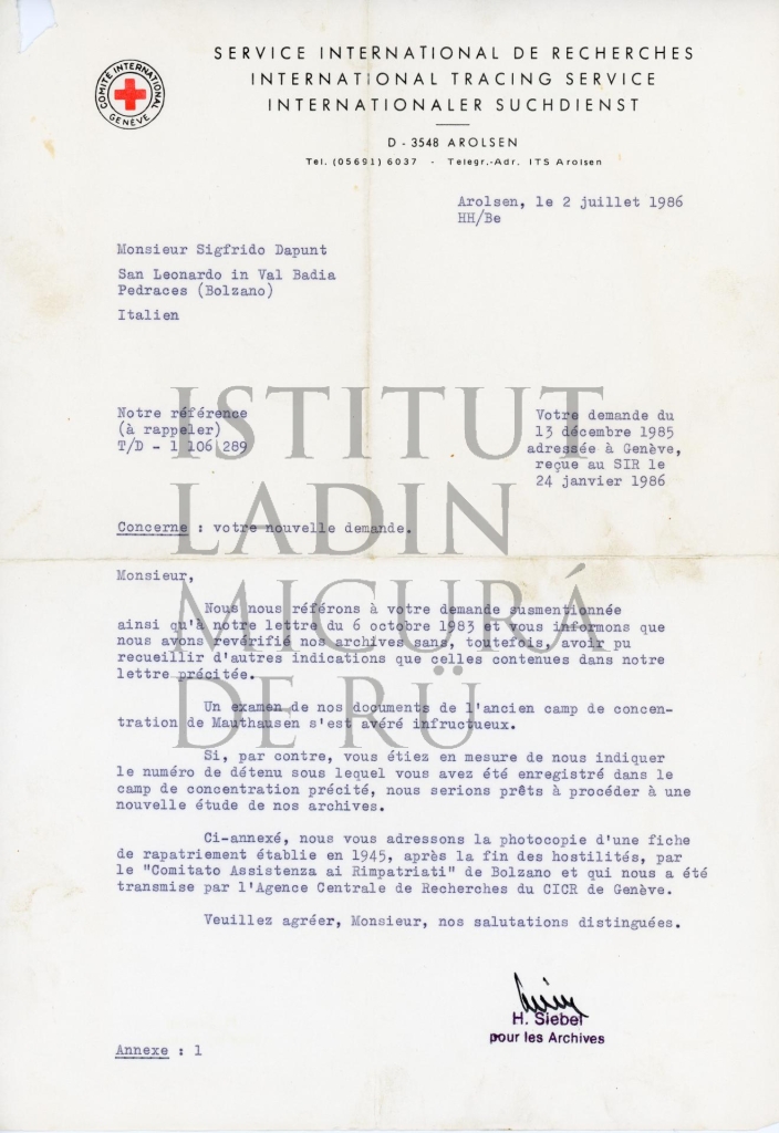 Descriziun: Lëtra dl Sorvisc Internazional de Archirida a Sigfried Dapunt scrita por franzesc, olache al ti vëgn dit che ai ne á nia ciafé tl archif documënc a so inom. Al messass ester n documënt injunté, mo chël ne é nia da ciafé.