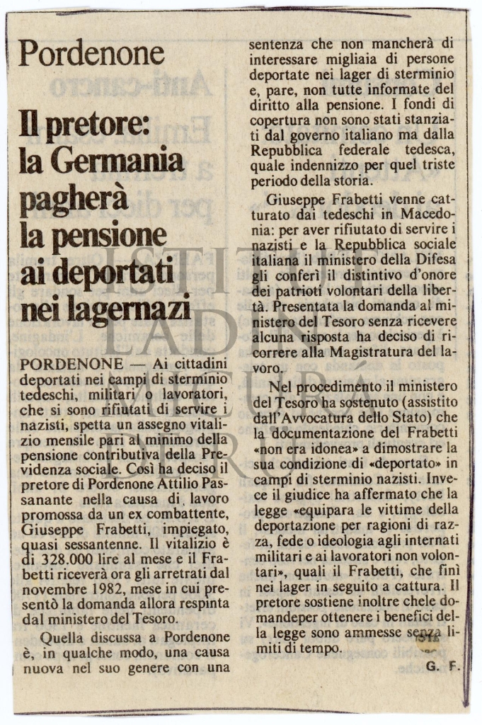 Descriziun: Articul de foliet che baia dla ponsiun de vera che ti speta ai deportá di lager nazisć; al vëgn porté dant n ejëmpl de n ël da Pordenone.