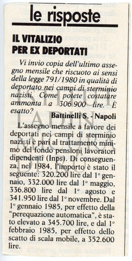 Descriziun: Pice articul che porta dant l'amunta dles ponsiuns de vera (dal 1984 al 1985) por i ex deportá ti lager nazisć.