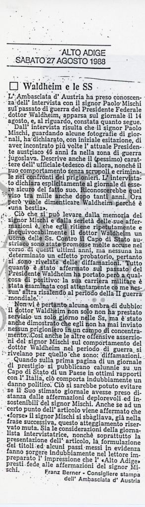 Descriziun: Copia de n pice articul publiché tl foliet "Alto Adige" en resposta al'intervista de Paolo Mischi publicada ai 14/08/1988; l'articul é sté scrit fora dal responsabl dl ofize stampa dl'ambasciada dl'Austria, che dij che les plüres/acüses de Paolo, y de düc i atri che á plüré Waldheim, é ma difamaziuns, y che ares podess roviné le bun raport politich di dui stac.