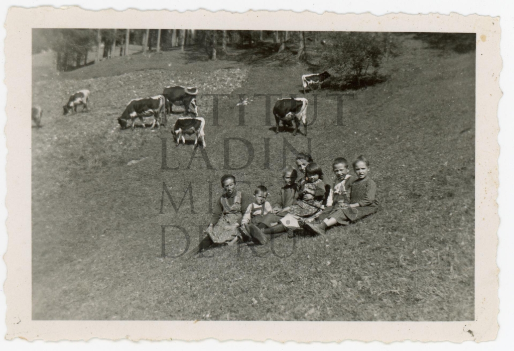 Descriziun: Fotografia de grup sön n pre; an vaiga les vaces doia.