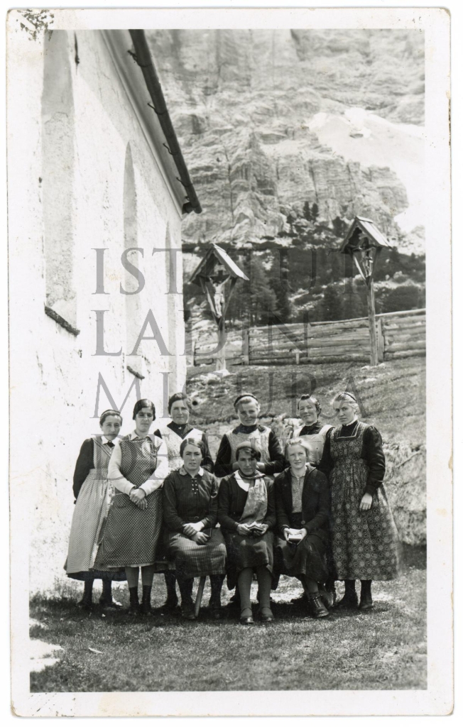 Descriziun: Fotografia tuta sö dlungia le santuar da La Crusc y che rapresentëia n grup de jones.