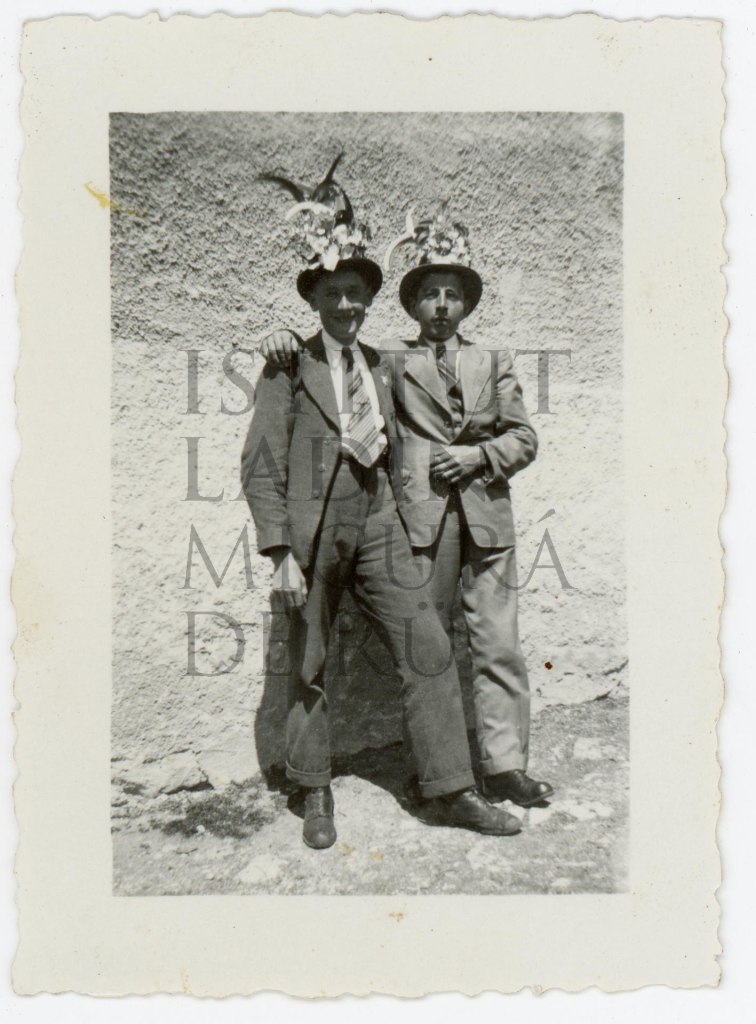 Descriziun: Fotografia che rapresentëia dui jogn, bonamënter de Badia, cun le ciapel da plömes.