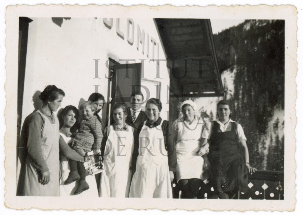 Descriziun: Fotografia de n grup de porsones dan dal Hotel Dolomiti a La Ila.