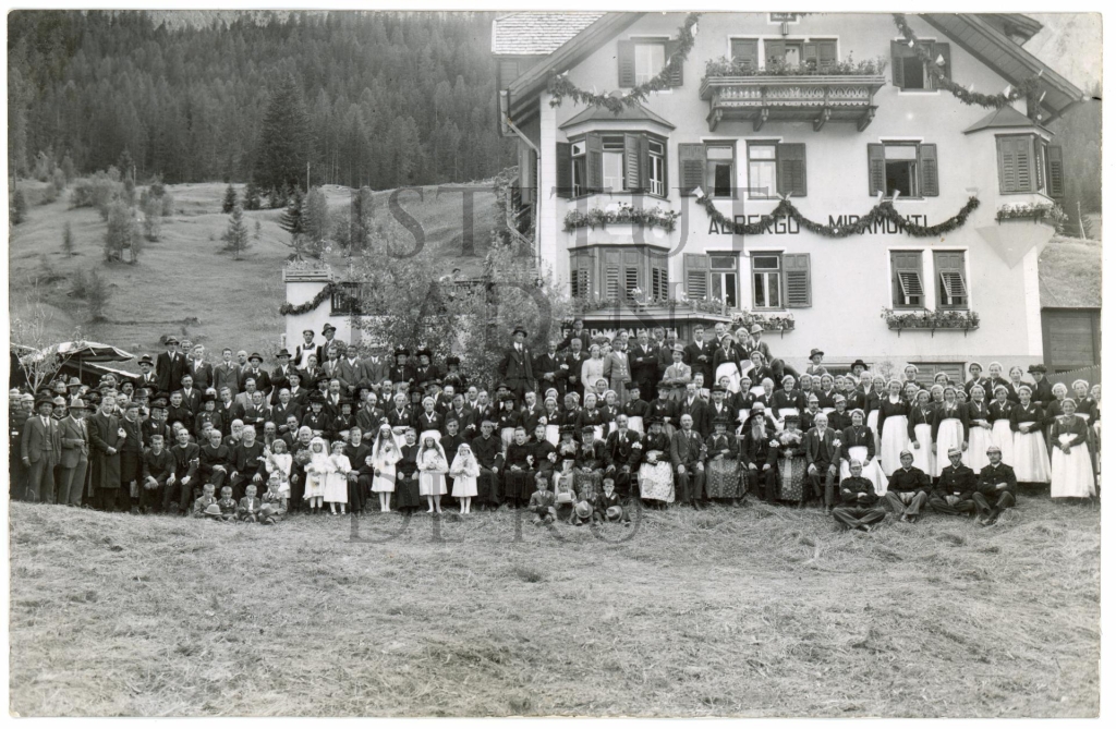 Descriziun: Fotografia de grup tuta sö dan l'"Albergo Miramonti" a Badia; bonamënter é chësta fotografia gnüda tuta sö le de dla Mëssa Novela de Siur Angel Dapunt.