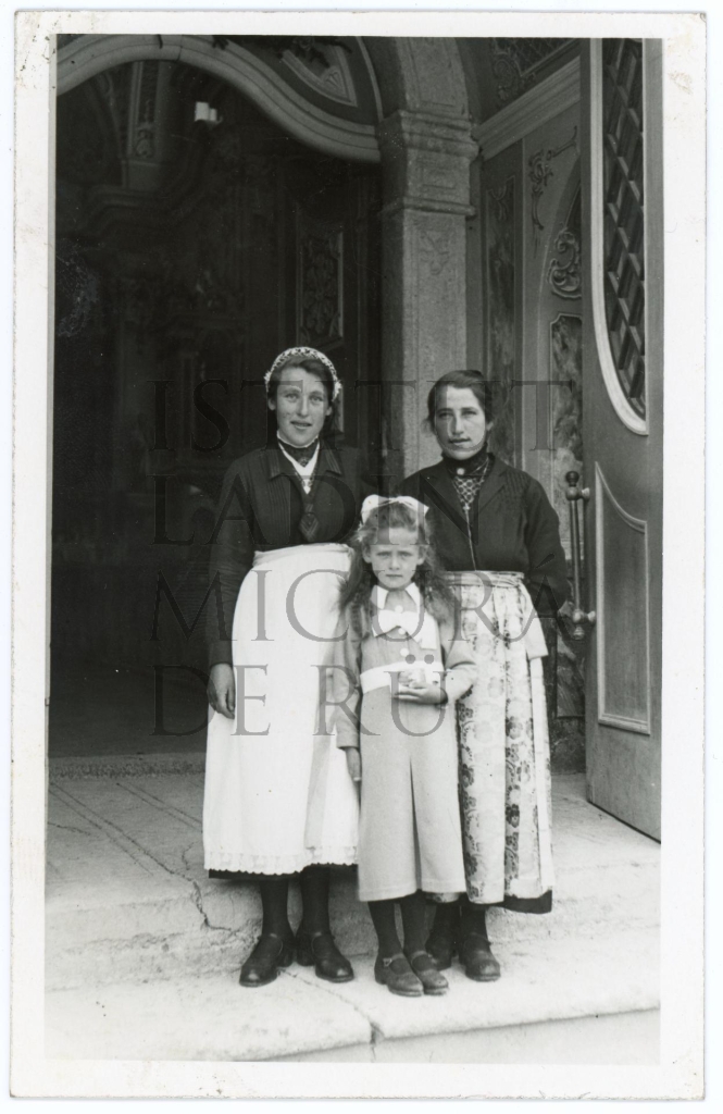 Descriziun: Fotografia che rapresentëia döes jones y na möta, metüdes sö dan dala porta prinzipala dla dlijia de Badia.