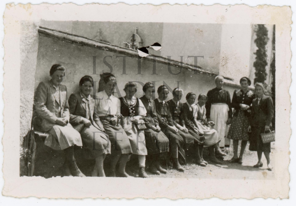 Descriziun: Fotografia che rapresentëia n grup de ëres sentades sö por mür; bonamënter éle n toch de mür dla dlijia de Badia.
