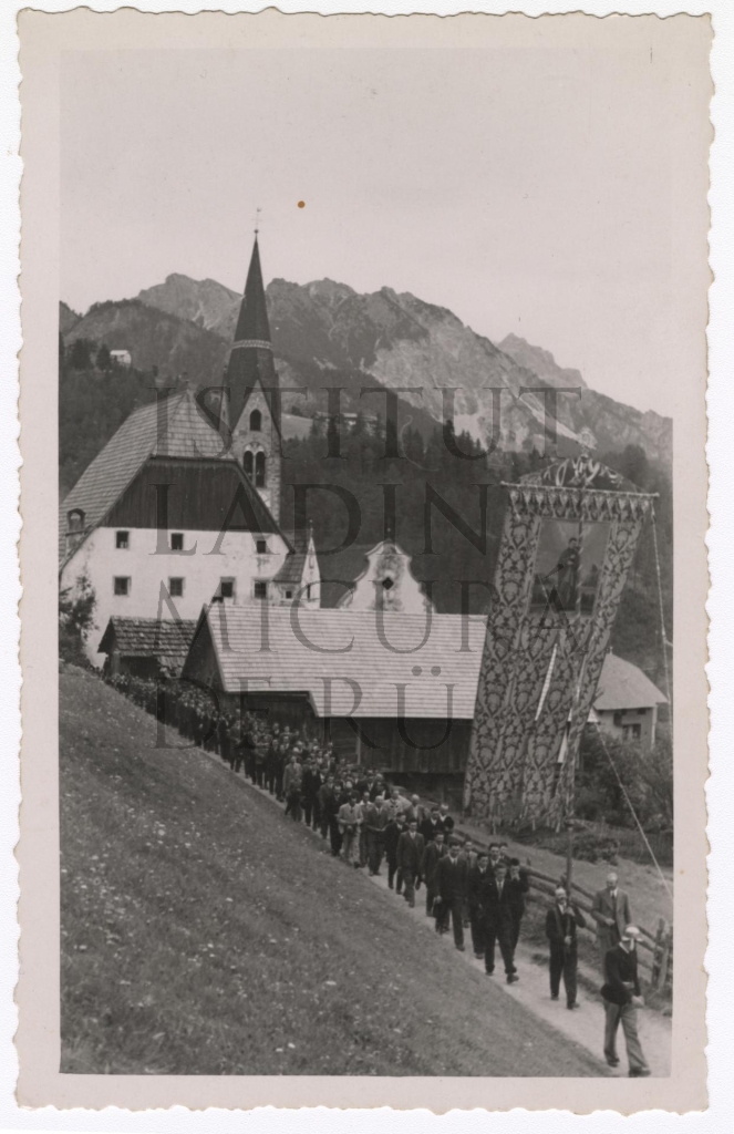 Descriziun: Fotografia che rapresentëia na prozesciun a La Pli de Mareo.