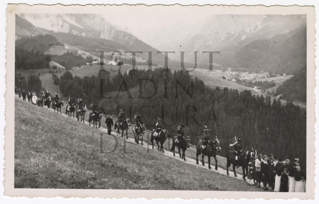 Descriziun: Fotografia che rapresentëia na prozesciun a La Pli de Mareo organisada en ocajiun de na Mëssa Novela. Doia pon odëi Curt y Al Plan.