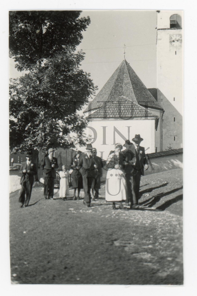 Descriziun: N grup de porsones vëgn fora de dlijia do la zerimonia da noza; dancá pon odëi i nüc.